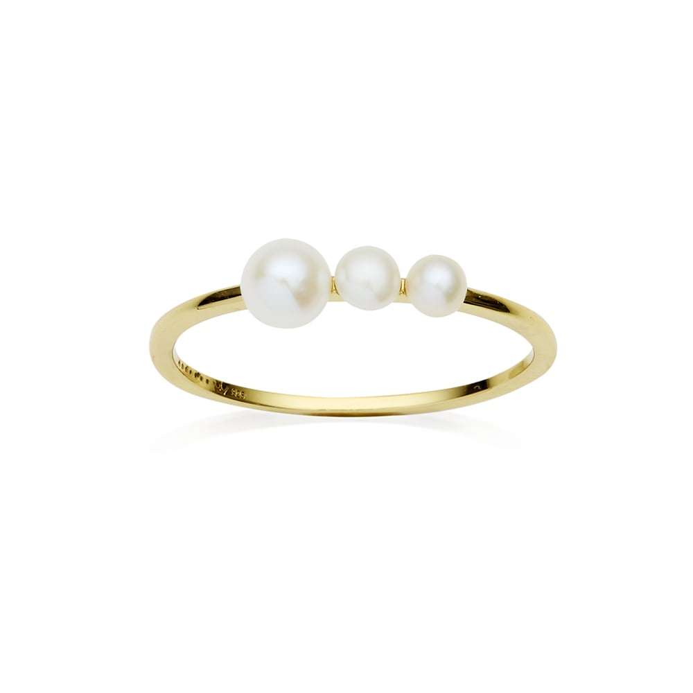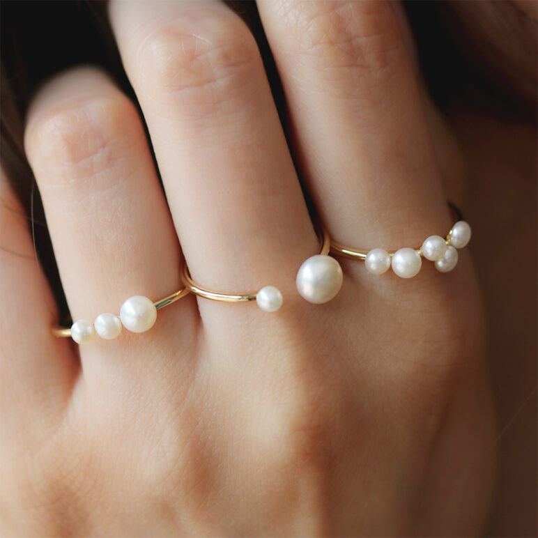 Delicate Freshwater button and Keshi pearls set on yellow gold-plated Sterling Silver. Designed to be stacked and layered.